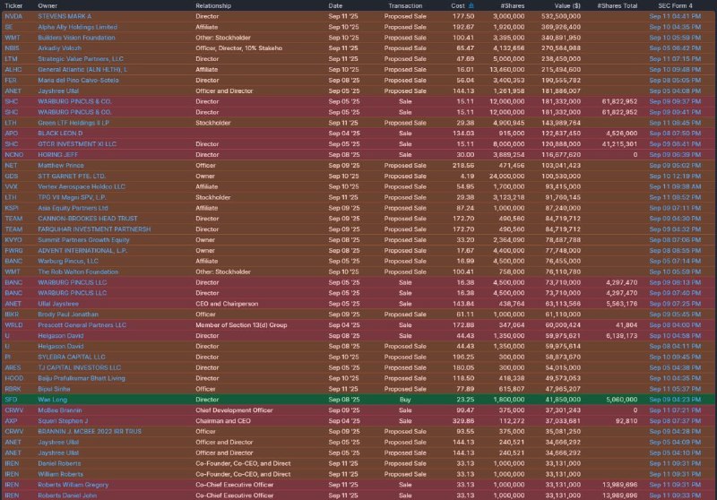 Согласно последним данным, инсайдеры выходят из активов массово. Только за последнюю неделю 198 из 200 крупнейших сделок пришлись на продажи. Эта тревожная тенденция лишь усиливается: если рассматривать период в две недели, то соотношение становится еще более пугающим — 398 продаж против ничтожных 2 покупок из 400 крупнейших операций.