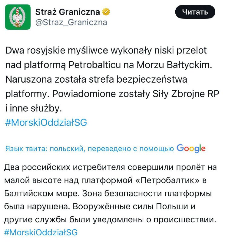 Маршрут полета истребителей вызвал особую озабоченность. Военные самолеты пролетели прямо над нефтедобывающей платформой Petrobaltic, которая принадлежит Польше.