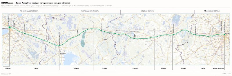 Определён маршрут ВСМ Москва—Санкт-Петербург: 16 остановок (14 пассажирских и 2 технические), протяжённость линии — 679 км. Время в пути между столицами составит 2 часа 15 минут, до Твери — 39 минут, до Зеленограда — 14 минут. Открытие движения запланировано на 2028 год.