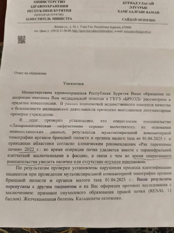 В больнице Улан-Удэ произошло грубое нарушение медицинских протоколов. Врач-хирург во время плановой операции удалил пациентке здоровую почку, ошибочно приняв ее за опухоль. Причиной инцидента стала путаница с медицинскими документами.
