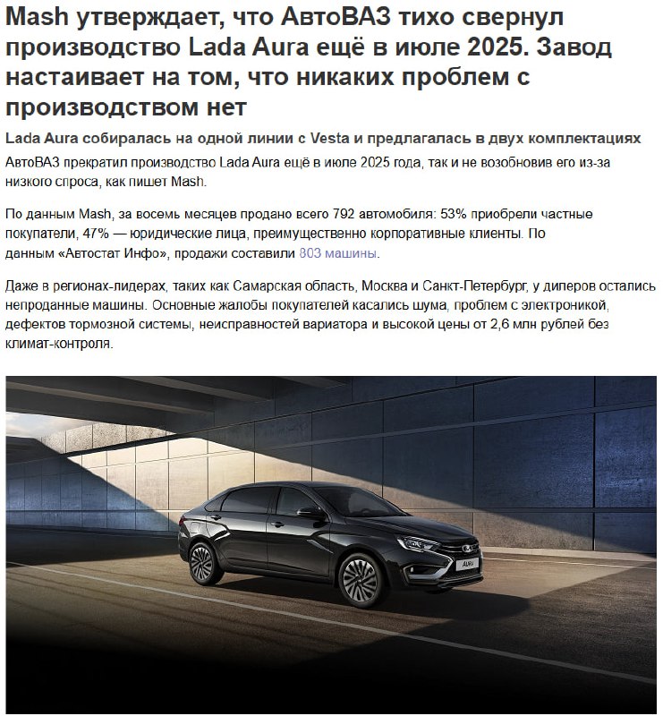 Компания АвтоВАЗ приняла решение о заморозке выпуска седана Lada Aura. Как стало известно, конвейер остановили ещё в июле текущего года, однако официального заявления от производителя не последовало.