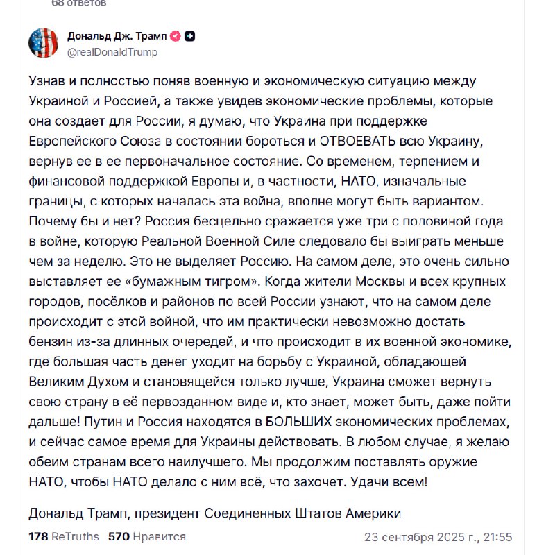 Президент США Дональд Трамп в своем выступлении выразил твердую уверенность в способности Украины восстановить территориальную целостность. Он заявил, что при активной поддержке Европейского союза страна обладает для этого всем необходимым.