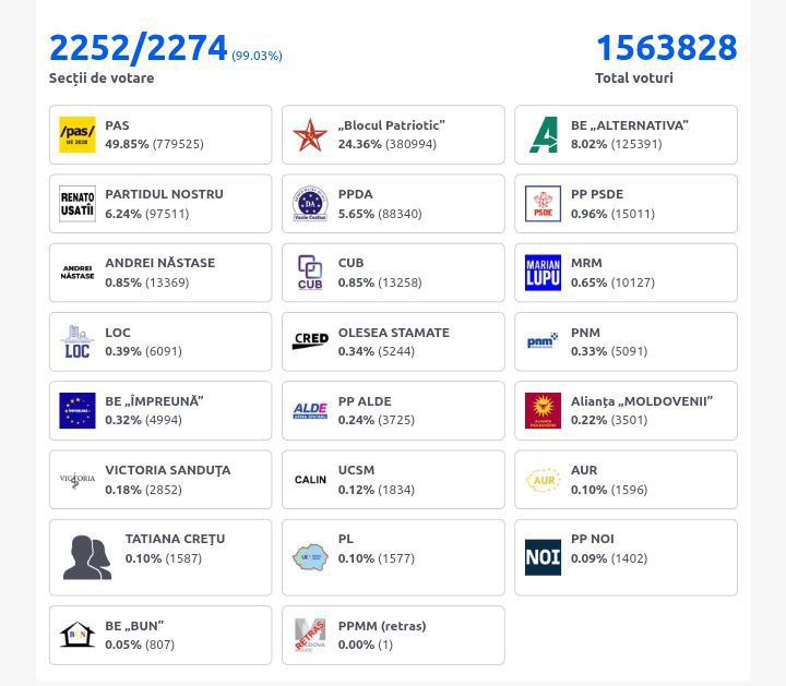 Партия действующего президента Майи Санду, PAS, одержала победу на парламентских выборах в Молдавии, набрав 49,8% голосов и сохранив парламентское большинство. При этом суммарно проходящие в законодательный орган оппозиционные партии получили больше голосов. Явка избирателей составила 51,9%.
