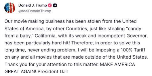 Дональд Трамп объявил о планах введения стопроцентных тарифов на всю кинопродукцию, созданную за пределами Соединенных Штатов. Эта мера затронет фильмы из Европы, Азии и других регионов мира.