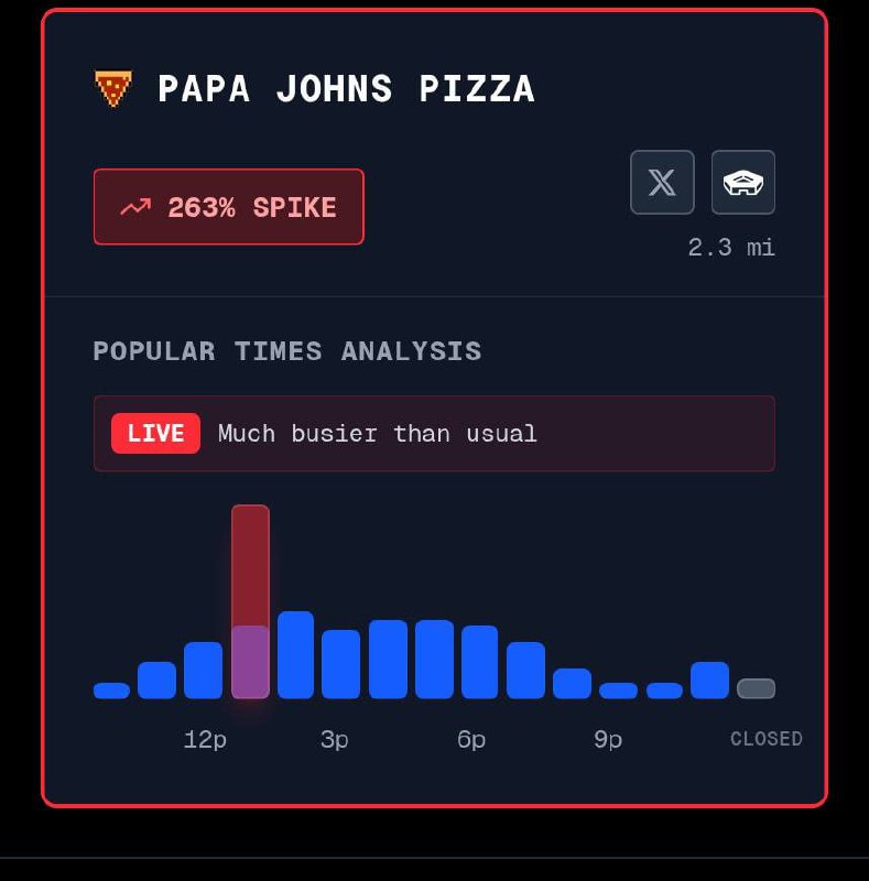 В Вашингтоне отмечают резкий рост так называемого «индекса пиццы» — неофициального индикатора, который отслеживает повышенную активность в здании Пентагона. Этот показатель фиксирует увеличение количества заказов еды на вынос для сотрудников, работающих сверхурочно, что традиционно связывают с планированием военных операций.