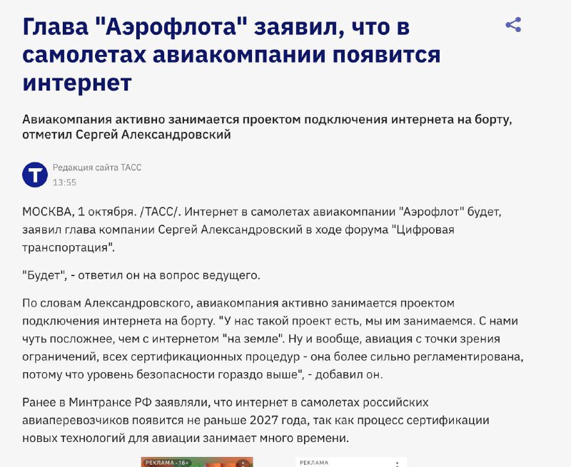 Генеральный директор авиакомпании «Аэрофлот» Сергей Александровский сообщил о планах по оснащению воздушного флота технологией для доступа в интернет во время полётов. Это позволит пассажирам оставаться на связи и работать онлайн.