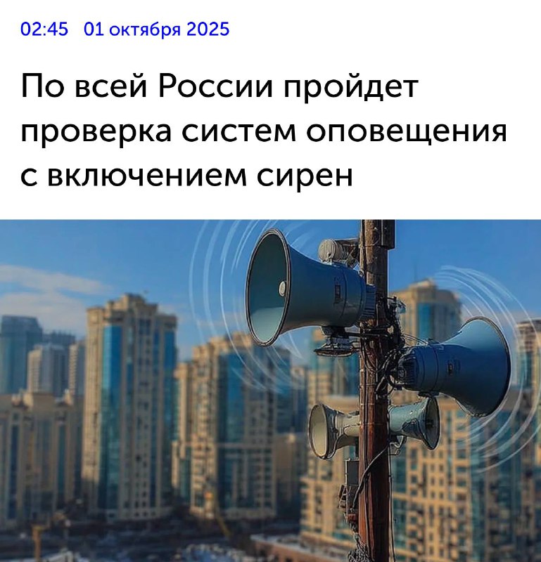 Сегодня, с 10:40 до 16:00 по московскому времени, по всей стране пройдёт комплексная проверка систем оповещения населения. Сирены и гудки прозвучат трижды в течение этого временного промежутка.