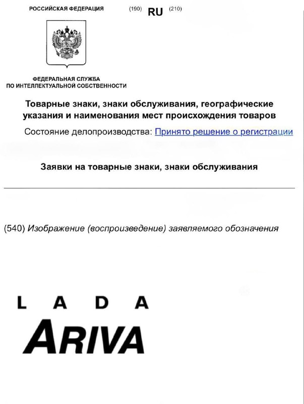 Федеральный институт промышленной собственности выдал свидетельство на товарный знак «Lada Ariva». Регистрация действует до 2034 года и предоставляет исключительные права на использование этого бренда.