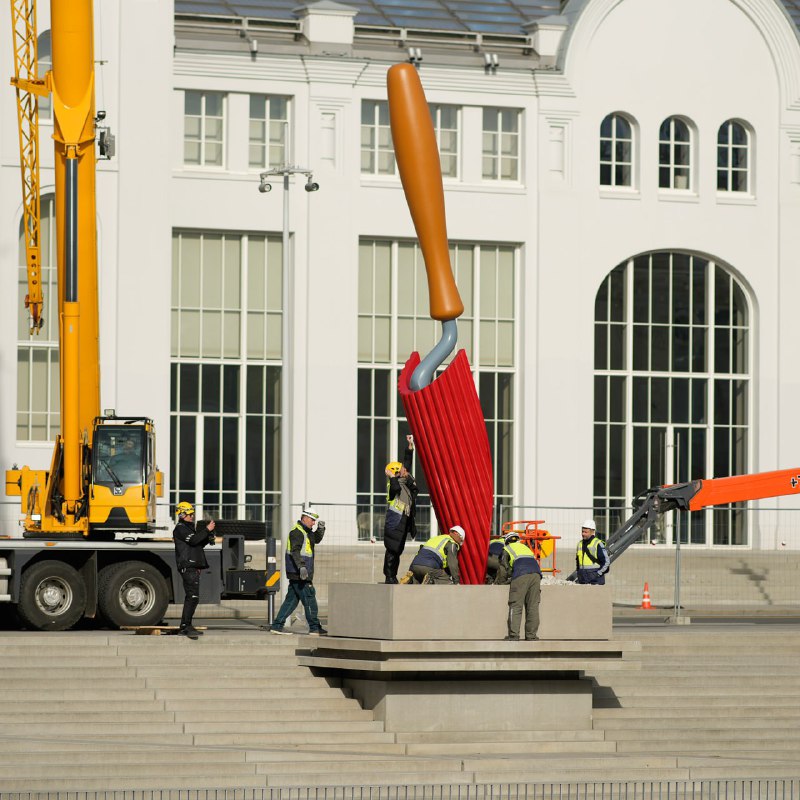 Новый арт-объект представляет собой огромную лопату серебристого цвета. В настоящее время специалисты завершают установку конструкции. Пока не объявлено, кто является автором работы и как она будет называться.