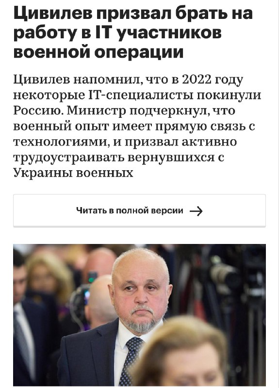 Министр энергетики РФ Николай Цивилёв выступил с заявлением, в котором предложил компенсировать отток IT-специалистов за рубеж за счёт бойцов, участвовавших в специальной военной операции. В своей речи он подчеркнул, что война — это тоже IT.