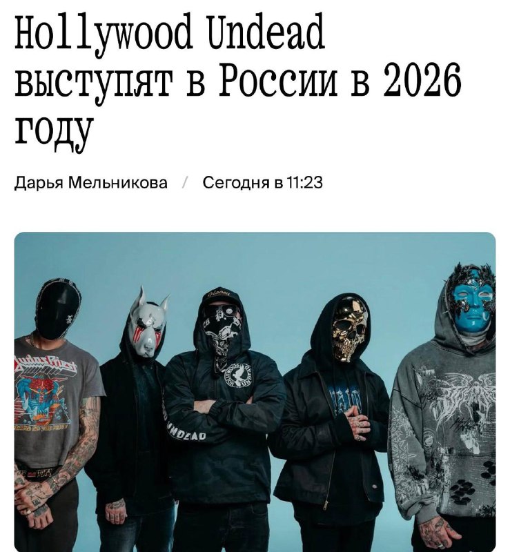 Американская группа Hollywood Undead вновь отправляется в тур по России. Согласно сообщениям в СМИ, музыканты дадут два больших концерта.