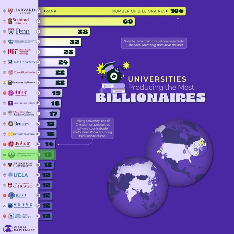 Согласно опубликованным данным, тринадцать выпускников МГУ смогли построить бизнес и заработать состояние свыше $1 млрд. Этот показатель позволил университету занять высокую позицию в глобальном списке.