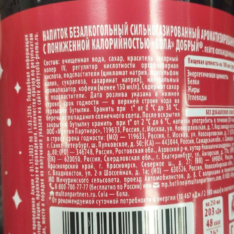 Производитель напитка «Добрый Cola» полностью изменил рецептуру, убрав из состава сахар. Вместо него теперь используются синтетические подсластители: цикламат натрия, ацесульфам калия, сукралоза и сахаринат натрия.