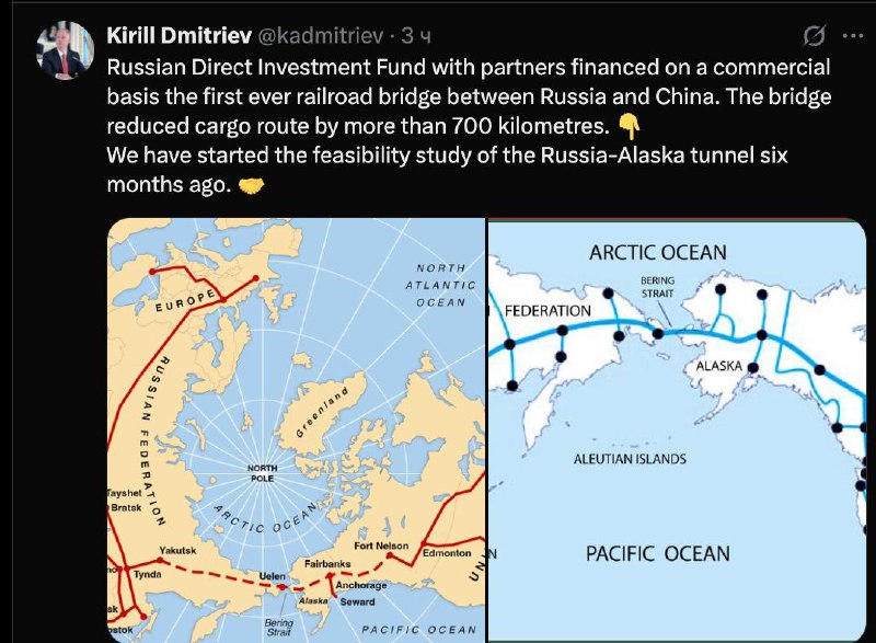 Российский фонд прямых инвестиций вместе с партнёрами на коммерческой основе профинансировал первый в истории железнодорожный мост между Россией и Китаем. Благодаря ему маршрут грузоперевозок сократился более чем на 700 километров. Мы уже шесть месяцев ведём технико-экономическое обоснование строительства тоннеля Россия — Аляска.