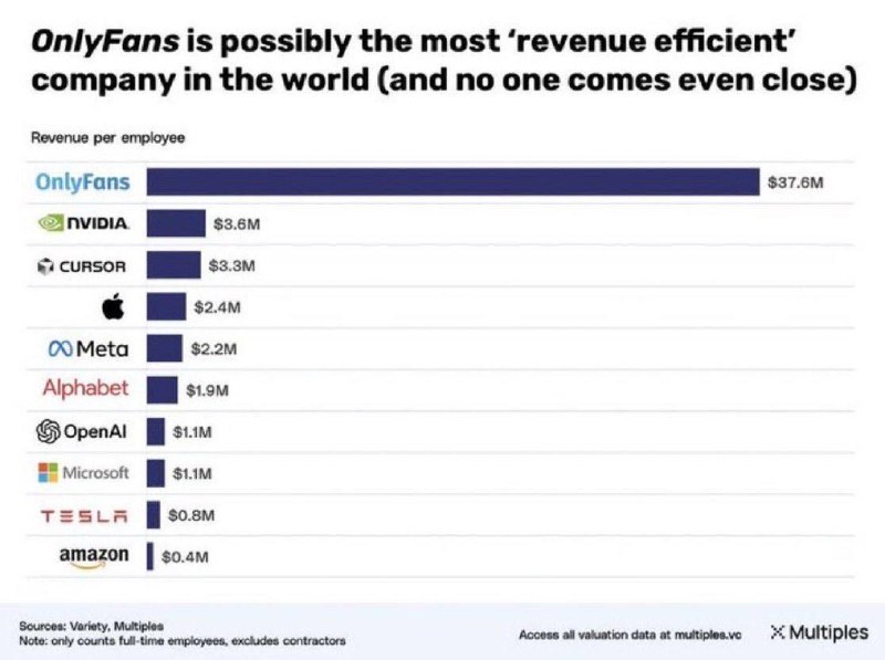 Согласно опубликованным данным, выручка OnlyFans на одного сотрудника составляет $37,6 млн. Этот показатель многократно превышает результаты технологических гигантов, традиционно считающихся лидерами по эффективности.