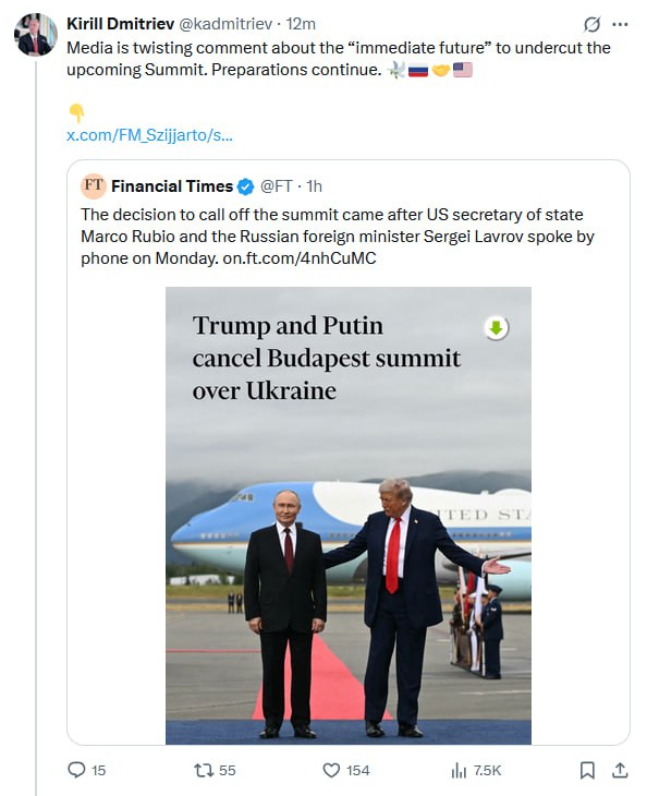 Специальный представитель Владимира Путина Дмитрий Дмитриев сообщил, что работа по организации предстоящего саммита лидеров России и Соединенных Штатов активно продолжается. Встреча, как ожидается, пройдет в Будапеште.
