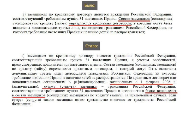 Согласно новым нормам, оформить льготную ипотеку можно будет только одну на двоих супругов. Второй супруг автоматически будет выступать в роли созаёмщика по этому единственному кредиту, что исключает возможность получения двумя отдельными кредитами.