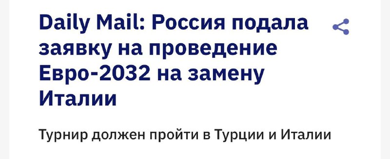 Российский футбольный союз подал заявку на проведение чемпионата Европы по футболу в 2032 году. Это решение было принято в тот момент, когда у УЕФА появились серьезные опасения относительно готовности инфраструктуры Италии, другого претендента на турнир.