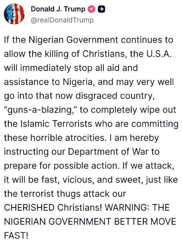 Президент Дональд Трамп объявил о военных приготовлениях в отношении Нигерии. В своем сообщении в социальной сети Truth Social он предупредил о возможном силовом вмешательстве США.