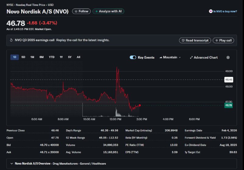 Новость об инциденте мгновенно отразилась на финансовых показателях компании. Акции Novo Nordisk продемонстрировали заметное снижение в течение торговой сессии.