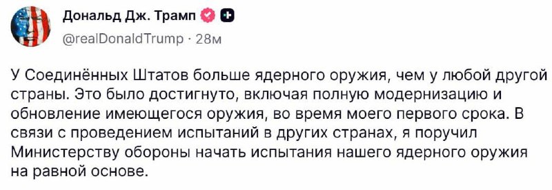 Администрация Дональда Трампа санкционировала возобновление испытаний американского ядерного арсенала. Соответствующее распоряжение уже направлено в Министерство обороны США для немедленного исполнения.