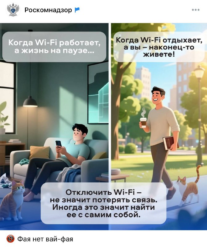 В своем сообщении регулятор подчеркнул, что иногда лучше обойтись без подключения. По мнению авторов картинки, отказ от постоянного нахождения в сети помогает вернуться к реальному общению и живому взаимодействию с миром.