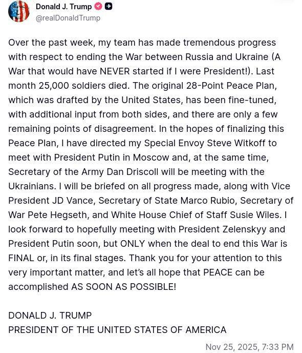 Одновременно с этим поступила информация о другом важном шаге. Президент США дал поручение своему представителю Уиткоффу организовать рабочий визит в Москву для встречи с Путиным.