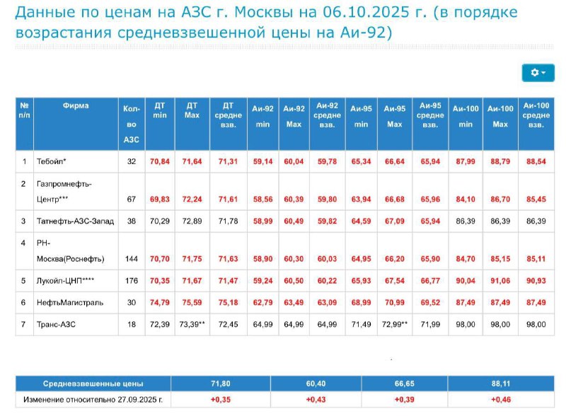 Литр бензина Аи-92 подорожал на 43 копейки — до 60,4₽. Аи-95 прибавил 39 копеек и теперь стоит 66,65₽. Дизельное топливо выросло в цене на 35 копеек, достигнув отметки 71,8₽.