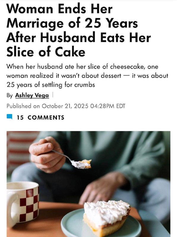 Женщина приняла решение о разводе с супругом после двадцати пяти лет совместной жизни. Непосредственной причиной стала, казалось бы, мелочь: муж съел оставленный ей кусок торта. Для неё этот поступок стал символом многолетнего пренебрежения её чувствами и потребностями.